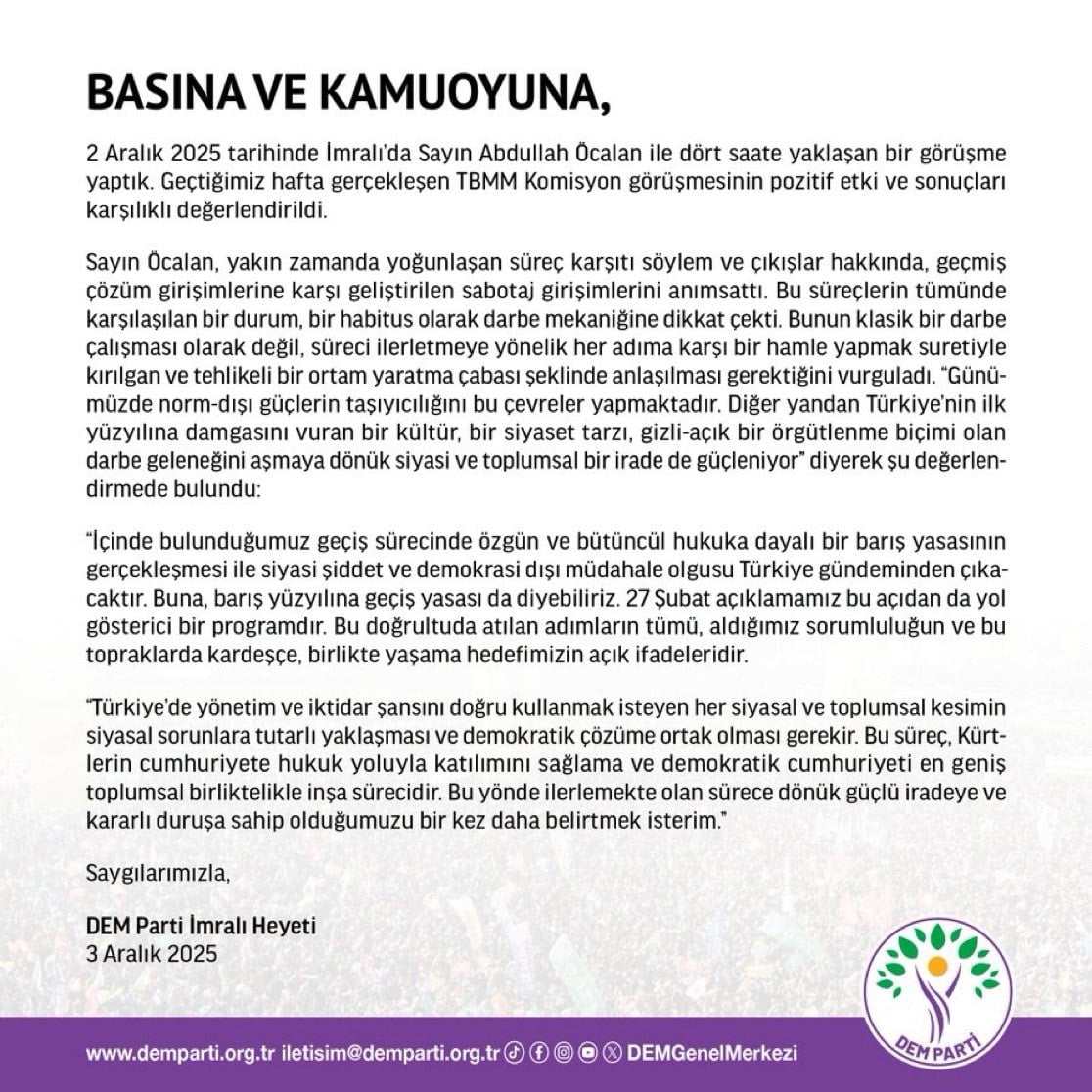 “İçinde bulunduğumuz geçiş sürecinde özgün ve bütüncül hukuka dayalı bir barış yasasının gerçekleşmesi ile siyasi şiddet ve demokrasi dışı müdahale olgusu Türkiye gündeminden çıkacaktır. Buna, barış yüzyılına geçiş yasası da diyebiliriz. 27 Şubat açıklamamız bu açıdan da yol gösterici bir programdır. Bu doğrultuda atılan adımların tümü, aldığımız sorumluluğun ve bu topraklarda kardeşçe, birlikte yaşama hedefimizin açık ifadeleridir.