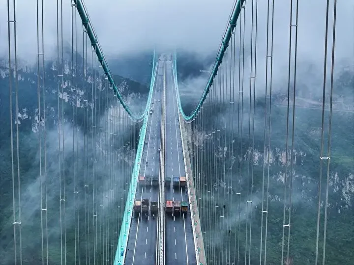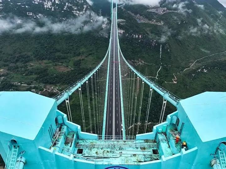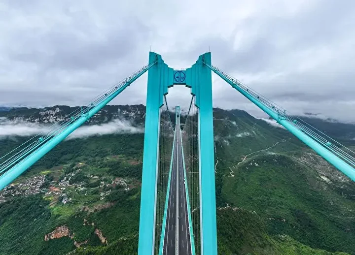 Guizhou eyalet yetkililerine göre, ana açıklığı bin 420 metre olan köprü, dağlık arazide inşa edilen dünyanın en uzun açıklıklı çelik kafes kirişli asma köprüsü oldu.