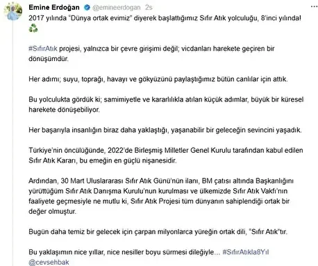 Emine Erdoğan’dan ‘Sıfır Atık Forumu’ paylaşımı : Türkiye’nin Sıfır Atık kararlılığını dünyaya taşıyacak