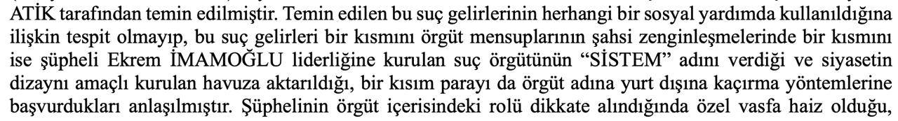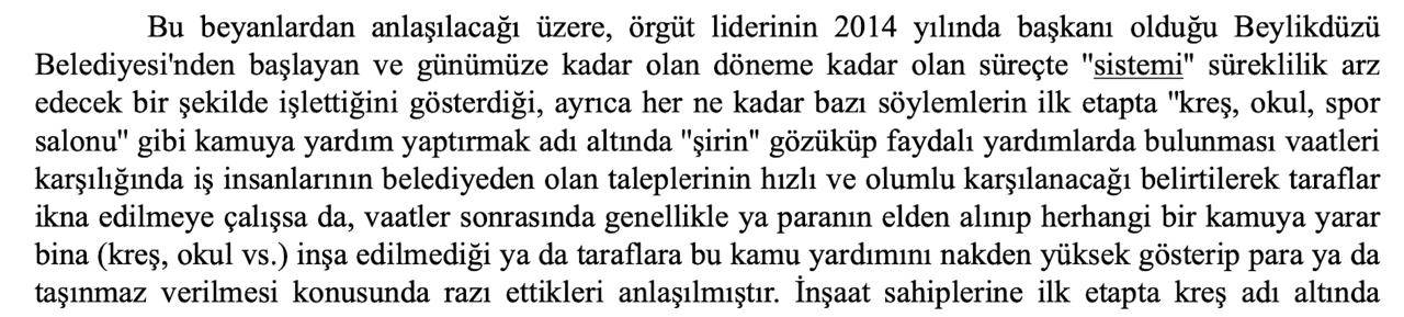 Bu istekler “kamuya yardım yaptırmak adı altında ‘şirin’ gözüküp faydalı yardımlardarda bulunma vaatleri” olarak değerlendirildi. İddianamede, İBB Başkanı Ekrem İmamoğlu’nun Beylikdüzü Belediyesi döneminden itibaren “sistem” adıyla kurduğu mekanizma kapsamında iş insanlarından bağış adıyla alınan paraların sosyal yardımlarda kullanılmadığı ve büyük bir kısmının siyasetin finansmanı olarak yurtdışına çıkarıldığı iddia edildi.
