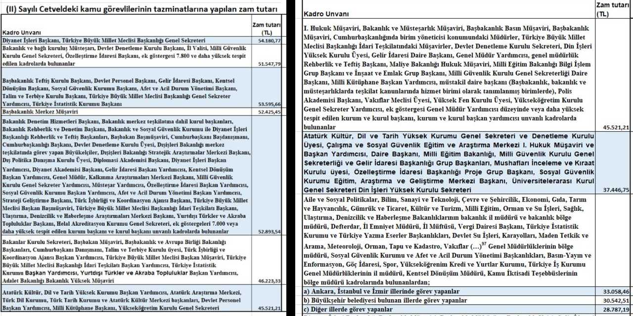 Daire başkanı, grup başkanı gibi pozisyondakilerin maaşlarında 37.446,75 TL, bakanlık müşaviri, genel müdür yardımcısı ve eşdeğeri pozisyondaki kamu görevlilerinin maaşlarında 45.521,21 TL artış yapıldı.