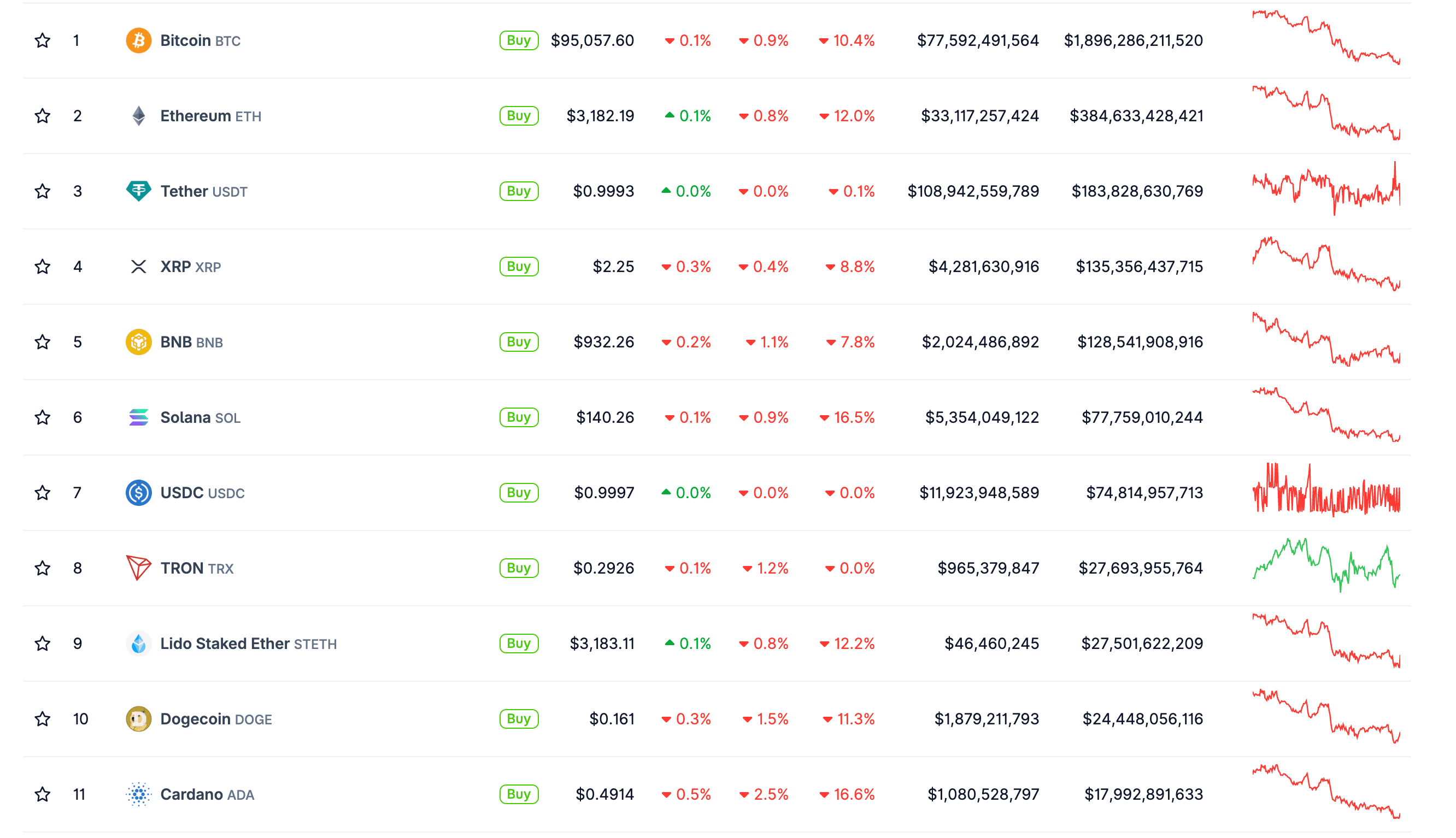 Major tokens extended losses alongside bitcoin. Ether ETH$3,186.69 slipped to $3,182, down 0.8% on the day and 12% over the week. XRP$2.2606 traded at $2.25 after an 8.8% weekly drop, while BNB BNB$933.56 fell to $932, losing 7.8% over the same period.